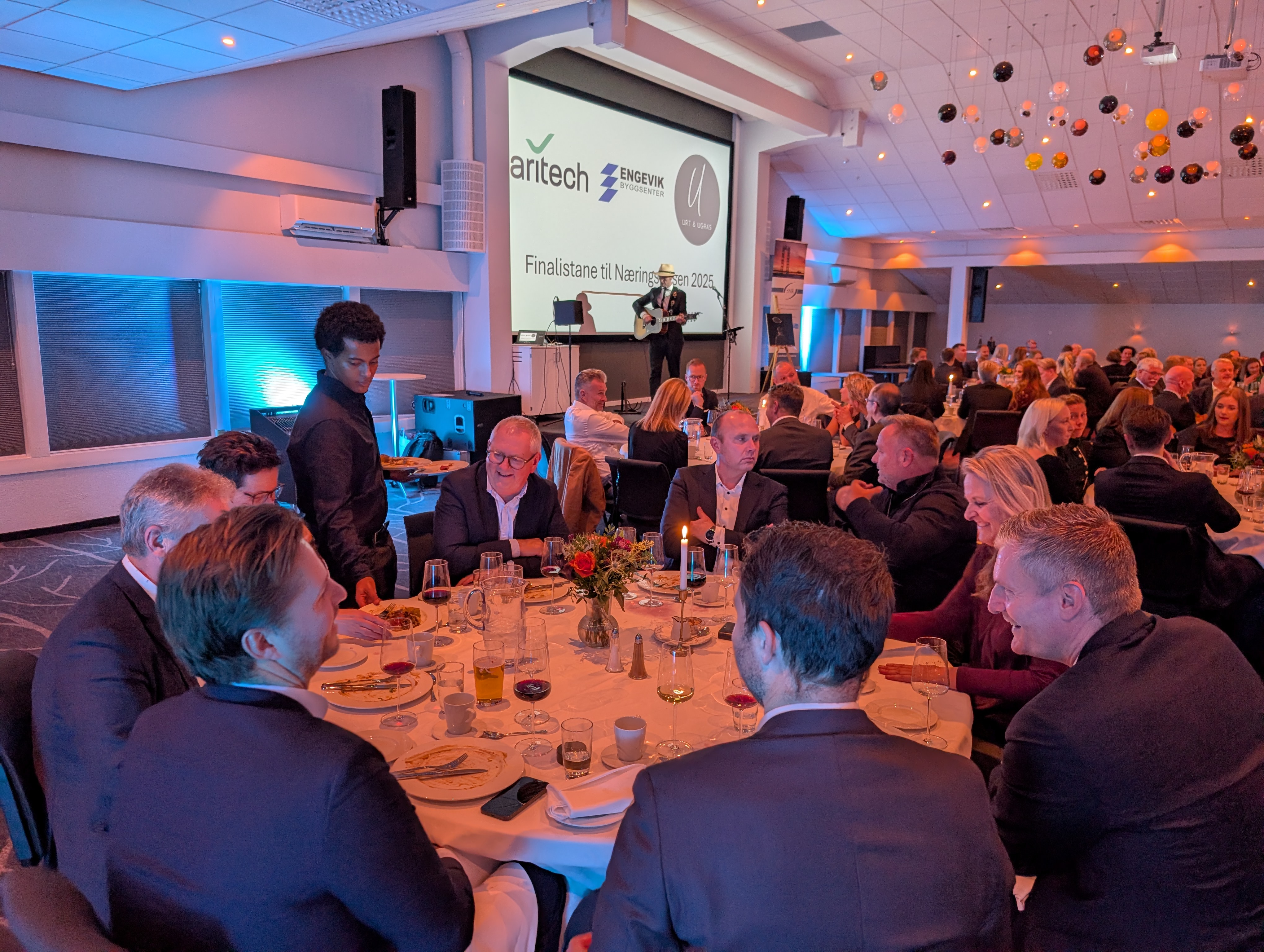 Nils Eivind Horneland stod for underhaldninga på festen og fekk salen med i trampeklapp då han hadde laga songvers om dei tre finalistane til Næringsprisen, Aritech, Engevik Byggservice og Urt & Ugras.